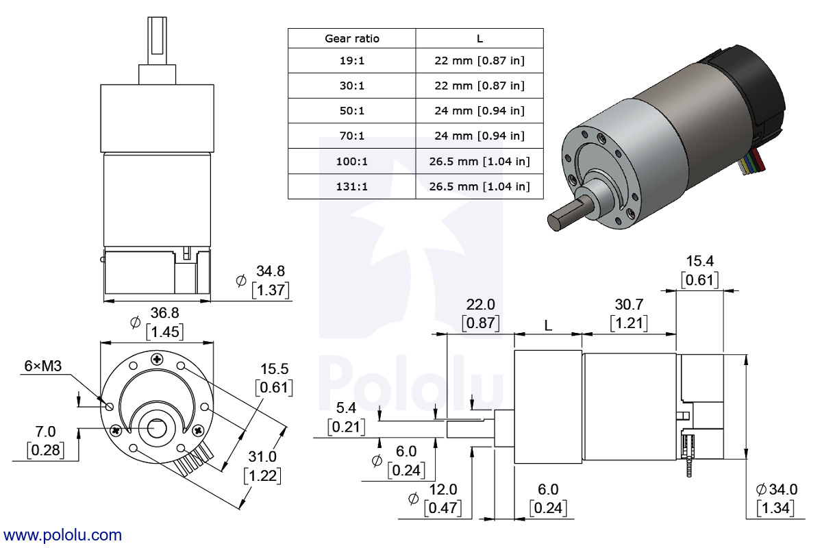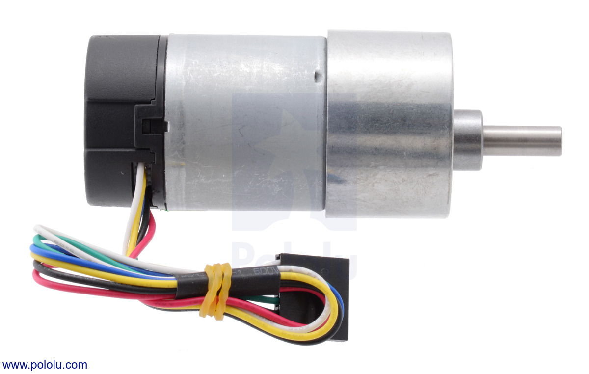 This gearmotor is a powerful 12V brushed DC motor with a 50:1 metal gearbox and an integrated quadrature encoder that provides a resolution of 64 counts per revolution of the motor shaft, which corresponds to3200 counts per revolution of the gearbox’s output shaft. These units have a 0.61"-long, 6 mm-diameter D-shaped output shaft. This gearmotor is also available without an encoder.
