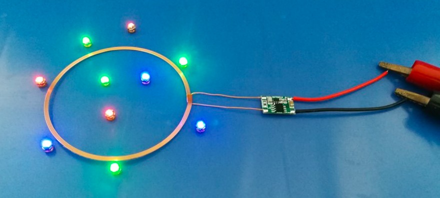 The same as wireless power supply, these LEDs are based on magnetic resonance coupling technology. It comes with a coil as a transmitter and there are small coils on each LED bead as receivers. When the two are coupled, energy can be transferred from the transmitter to the receiver through the air, paper, or plastic casing, and the LEDs will light up.