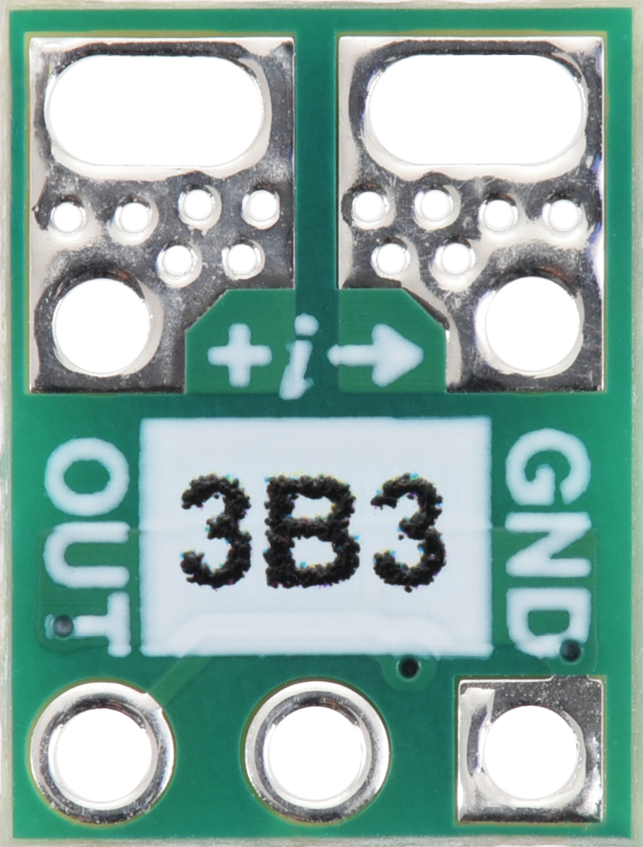 This micro carrier features the ACS37041KLHBLT-030B3, which is intended for nominal 3.3 V operation and is designed for bidirectional input current from -30 A to +30 A. This version can be visually distinguished from the other versions by the “3B3” printed on the bottom side, as shown in the left picture above.
