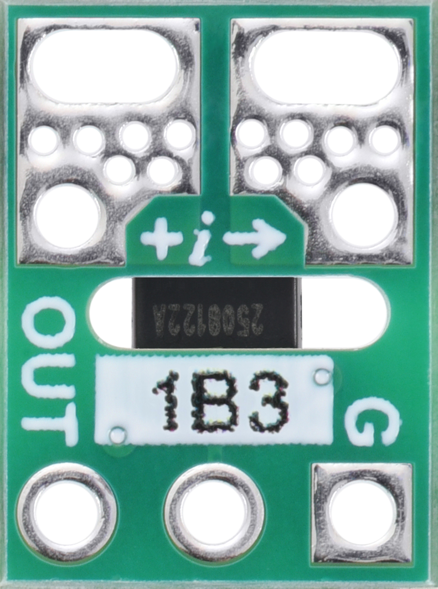 This micro carrier features the ACS37042KLHBLT-010B3, which is intended for nominal 3.3 V operation and is designed for bidirectional input current from -10 A to +10 A. This version can be visually distinguished from the other versions by the “1B3” printed on the bottom side, as shown in the left picture above.