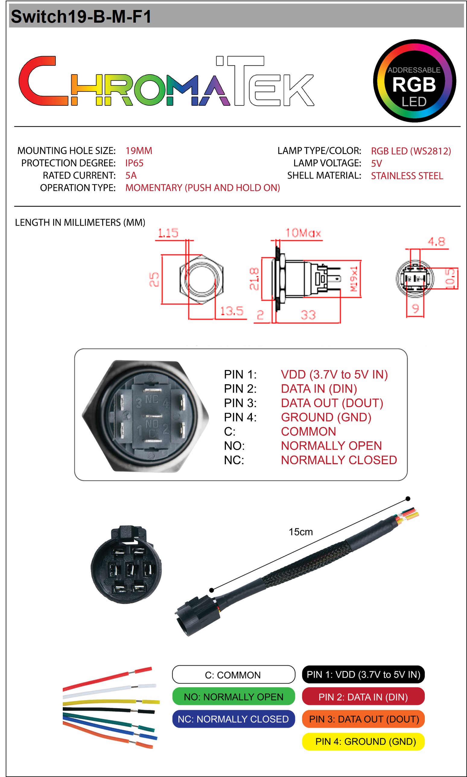 To use the NeoPixel Color LED: Power the internal NeoPixels with +5V, ground and a NeoPixel signal line - it's a lot easier than wiring up 3 separate RGB LED diodes. Best of all, the NeoPixel signal is chainable, so you can light up multiple switches in one panel.