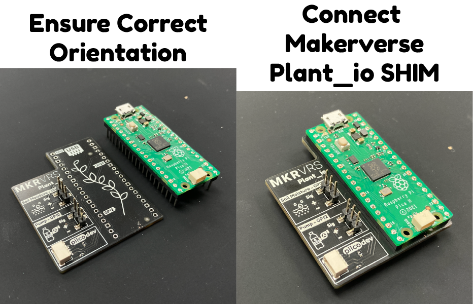 Plug the Pico into the Plant_io SHIM as shown. Note it's possible to make this connection backwards, or even upside down - be careful.