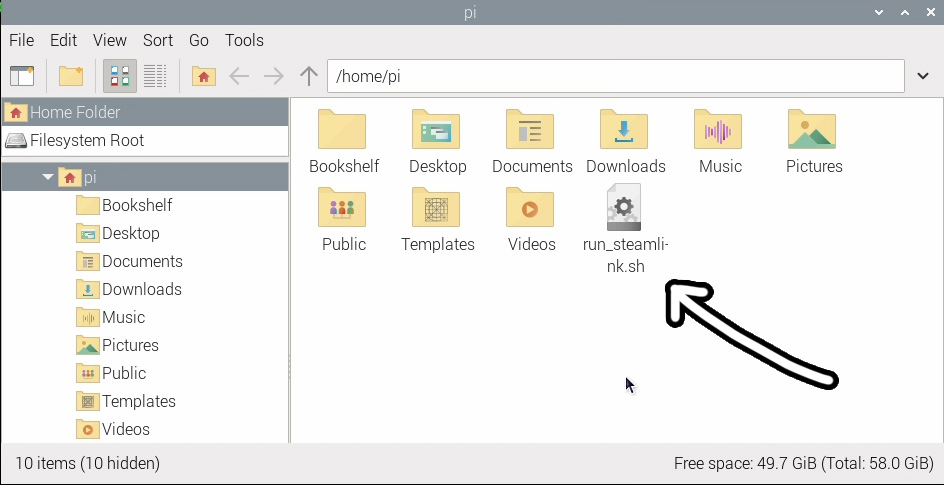 We can test that this script is working correctly by heading to our Pi's home folder (if you open up a new file explorer window it should default to this location). In there, you will find the shell script we just created and you can double click on it and hit execute to verify that it works.