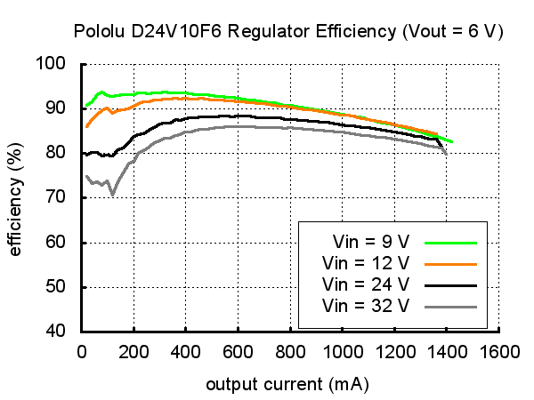 The efficiency of a voltage regulator, defined as (Power out)/(Power in), is an important measure of its performance, especially when battery life or heat are concerns. This family of switching regulators typically has an efficiency of 80% to 93%, though the actual efficiency in a given system depends on input voltage, output voltage, and output current. See the efficiency graph near the bottom of this page for more information.