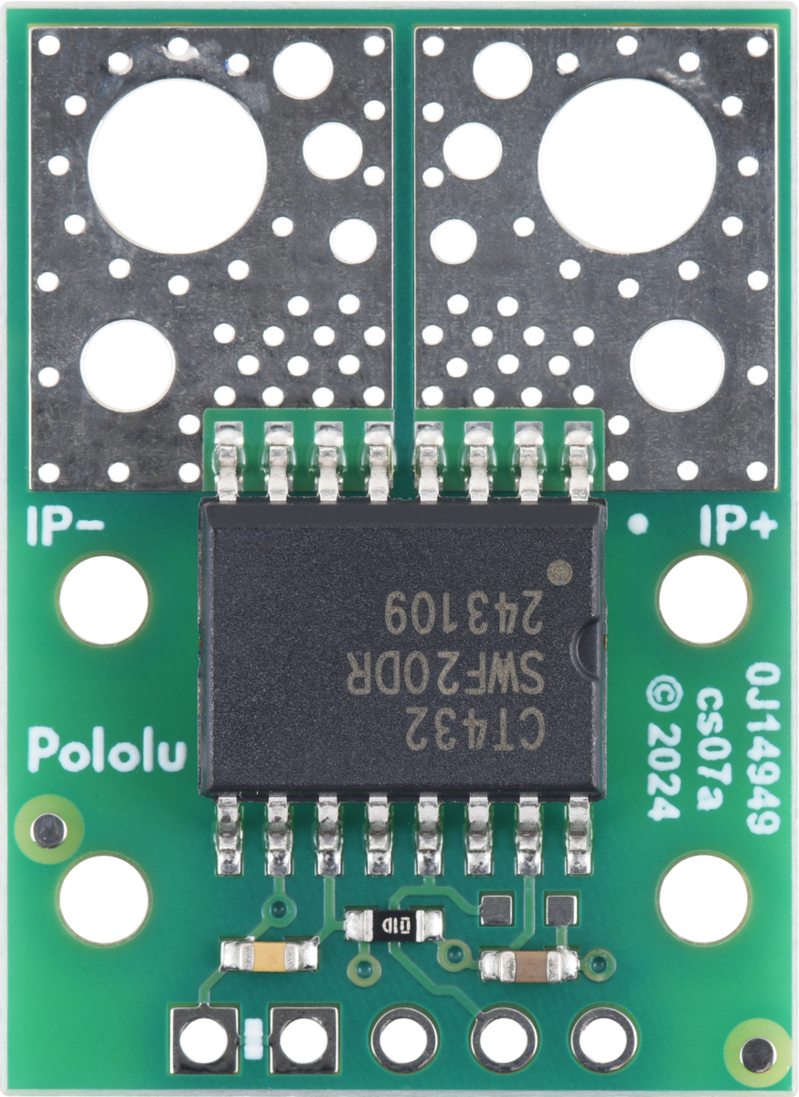 Depending on the version, the CT432 and CT433 can measure up to ±70 A. However, the sensor chip will typically overheat at lower currents. In Pololu's tests, Pololu found that Pololu's 2-layer CT432/CT433 compact carrier board (cs07a) could conduct about 45 A continuously, and the 4-layer compact carrier board (cs07b) could conduct about 50 A continuously, without reaching the thermal limit for the IC. (Sensors with ranges under 45 A use the cs07a board while sensors with ranges over 45 A use the cs07b board.) Pololu's tests were conducted at approximately 25°C ambient temperature with no forced air flow.