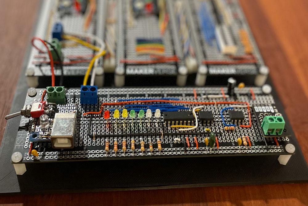 The shift register drives our LEDs, each with a current limiting resistor. The resistor values are chosen to graduate the brightness of the LEDs across the meter. If you choose different LEDs to the BOM or decide you want the brightnesses to be identical across the meter, you may have the experiment with the resistors.