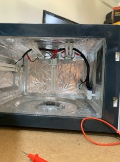 Unless your microwave has a highly reflective interior, you’ll want to line it with a reflective material to allow for maximum efficiency and exposure from your UV bulbs. I used hot-glue and aluminium foil (with a heat gun to evenly melt the glue under the foil) and aluminium tape to seal the edges.