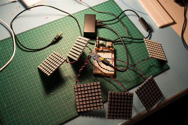 I started experimenting with 8x8 RGB LED NeoPixel matrices, which could be programmed to display any manner of digital imagery - utilising Adafruit's Fadecandy dithering controller coupled with a single board 3.3V-5V microcomputer IE Raspberry Pi Zero Wifi, Adafruit Huzzah ESP8266, Adafruit Trinket or Arduino Nano.