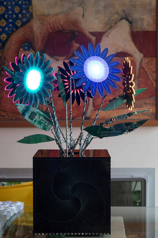 This piece combines recycled electronics extracted from decommissioned computers and new electronic components. I had an idea I wanted to incorporate a lighting element into a contemporary sculpture so it was just a matter of coming up with a theme to bring it all together.