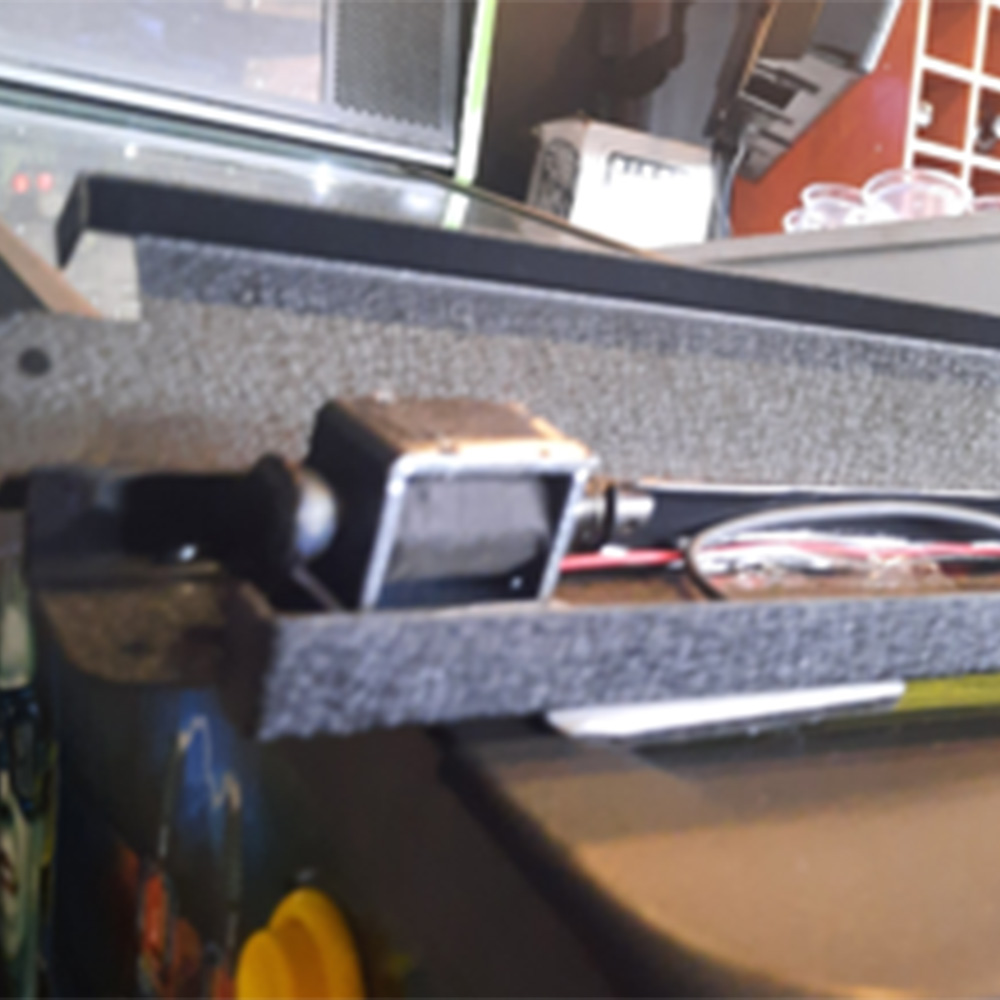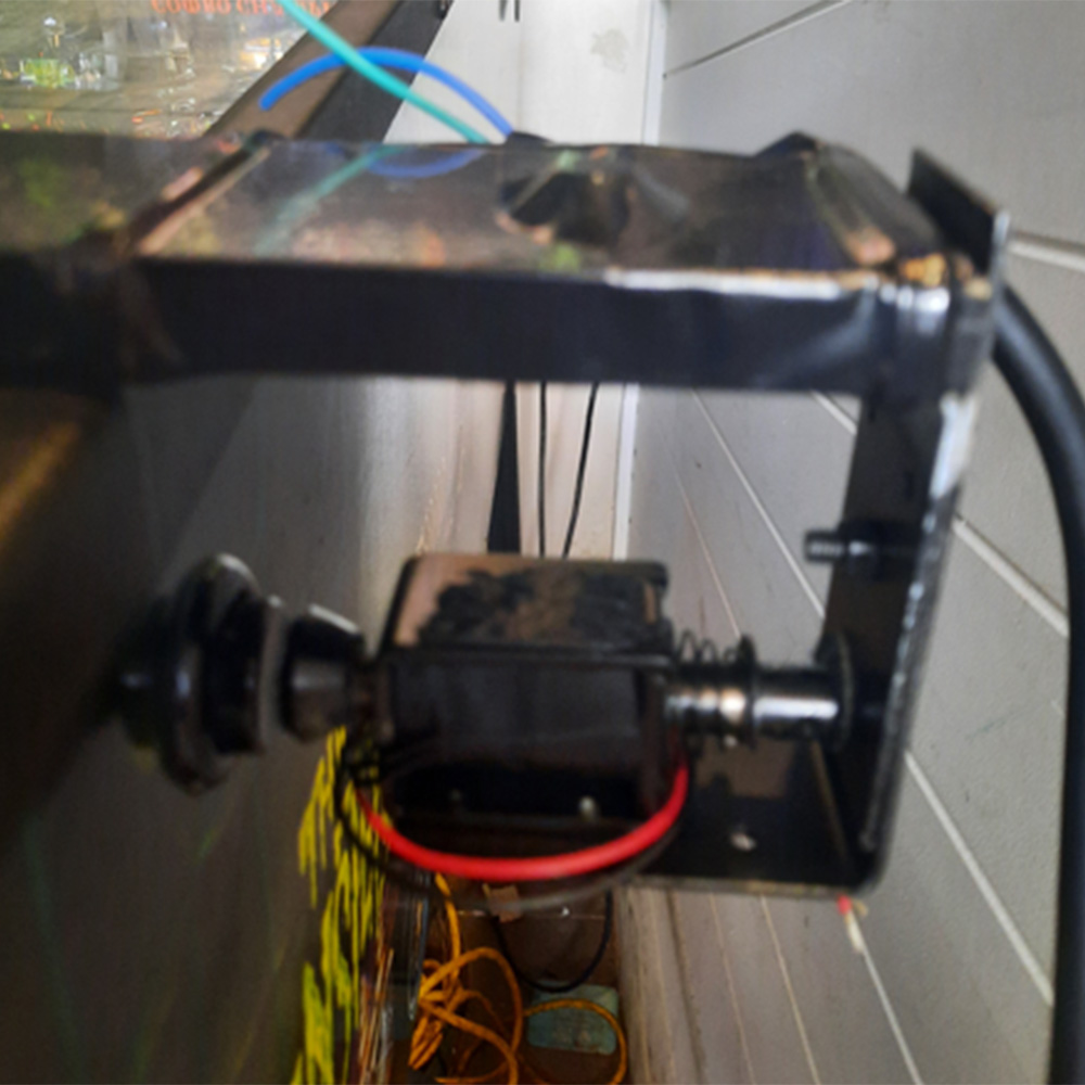 The final accessibility piece: enabling users to start a new game independently. We purchased a small push-pull solenoid (ADA412) that mounts on top of the machine. When the user opens their mouth wide, it triggers the start button.