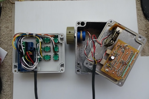 The Bodnar board is housed in the grey box, that is the reason for the 350mm of wire between this and the Arduino. There are 9 rotary encoders also fitted. I have fitted the BU0836A Switch Matrix Breakout Board to simplify things and assigned switches 1 to 18 as rotary encoder inputs.
