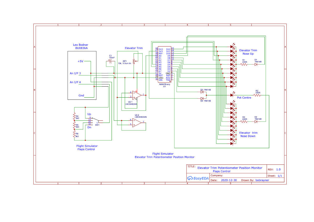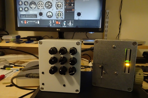 Changed mapping to -30 - +31 to suit my application better. Monitoring is more sensitive, 33% of rotation instead of 50%. Each function in isolation works flawlessly. When together and the Arduino powered from a Bodnar board some interference/instability appeared. This showed up as a jittering of the elevator trim wheel on the screen graphic. Also a slight flickering of the LEDs. This did not seem to affect the aircraft flight but was quite annoying as I felt this should not happen. Temporary solution 10uF tantalum cap between analog inputs (both effectively connected together) and ground. This seemed to keep it quite a fair bit for the time being. Time constant due to 10uF did not prove to be a concern in practice.