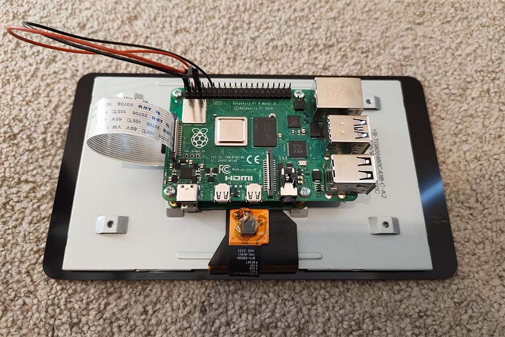 - Fix the Pi to the 7” touch screen - noting the preferred orientation, which factors in cable management and clearances, etc. Attach the ribbon cable to the appropriate slot on the Pi. Connect the two provided jumper cables between the 7” screen and the Pi’s GPIO pins for 5V (red) and ground (black)