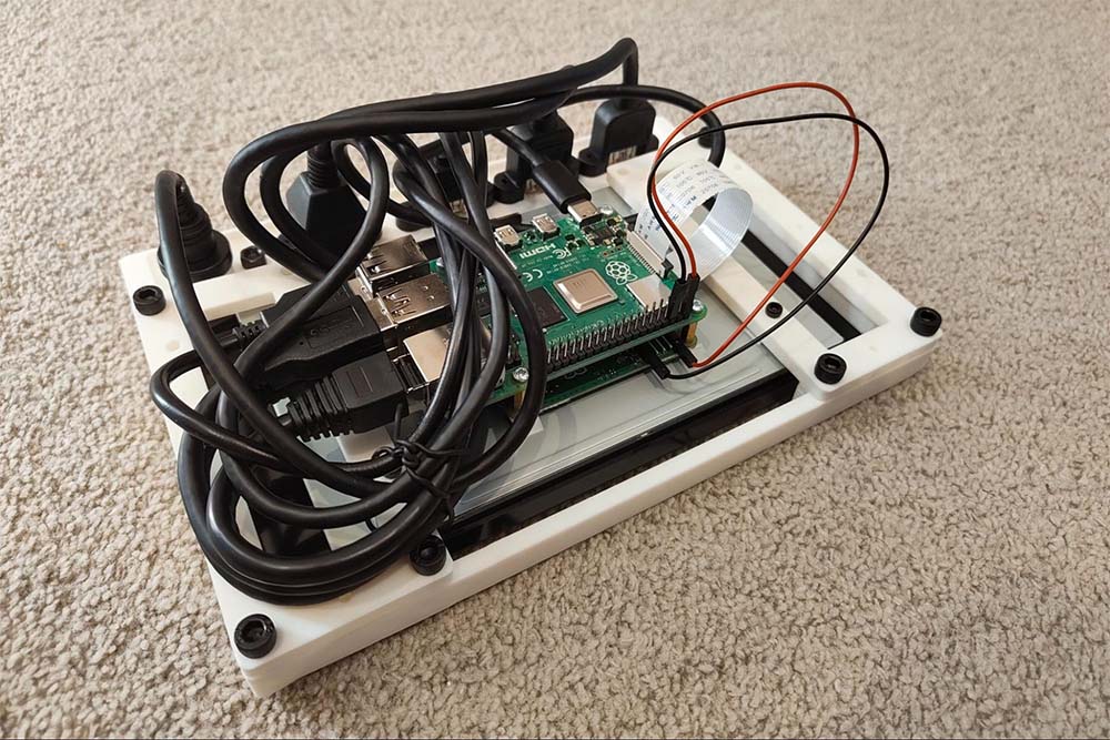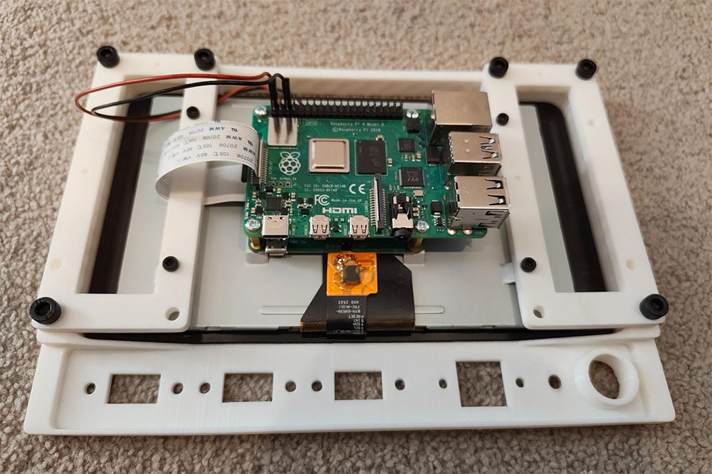 - Fix the official Raspberry Pi 7” touch screen to the 3d printed panel assembly - noting the correct orientation. Attach the provided ribbon cable if using a Pi 4 or the equivalent ribbon cable for the Pi 5, which you must purchase separately.