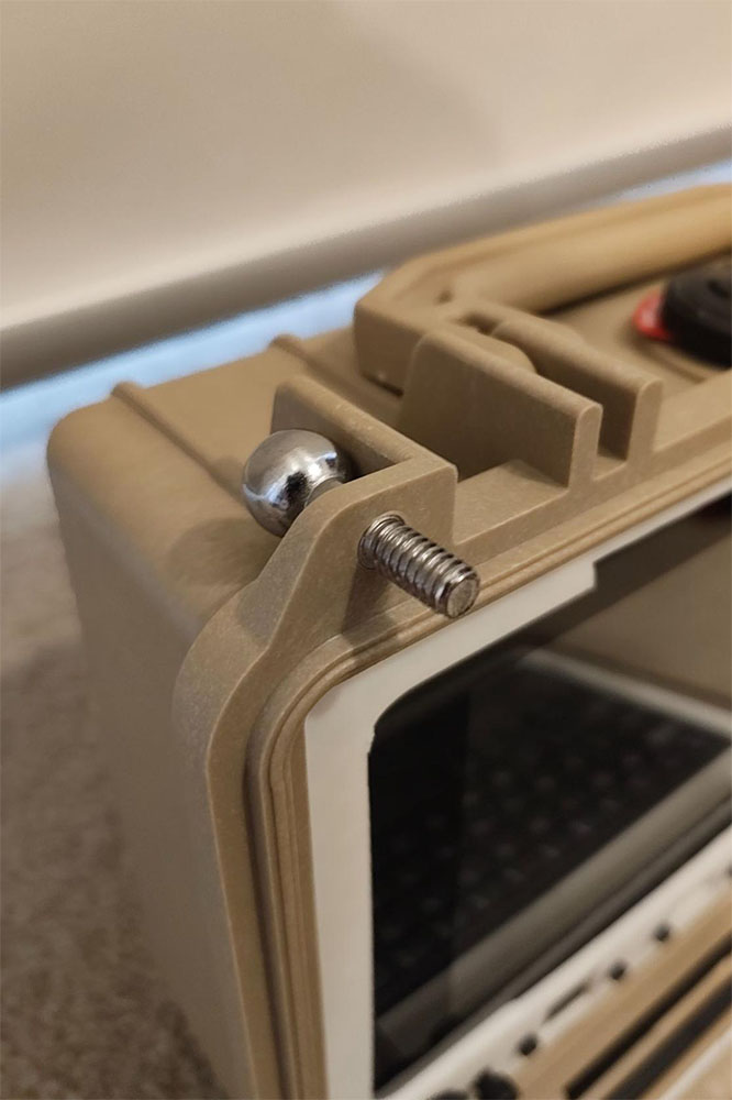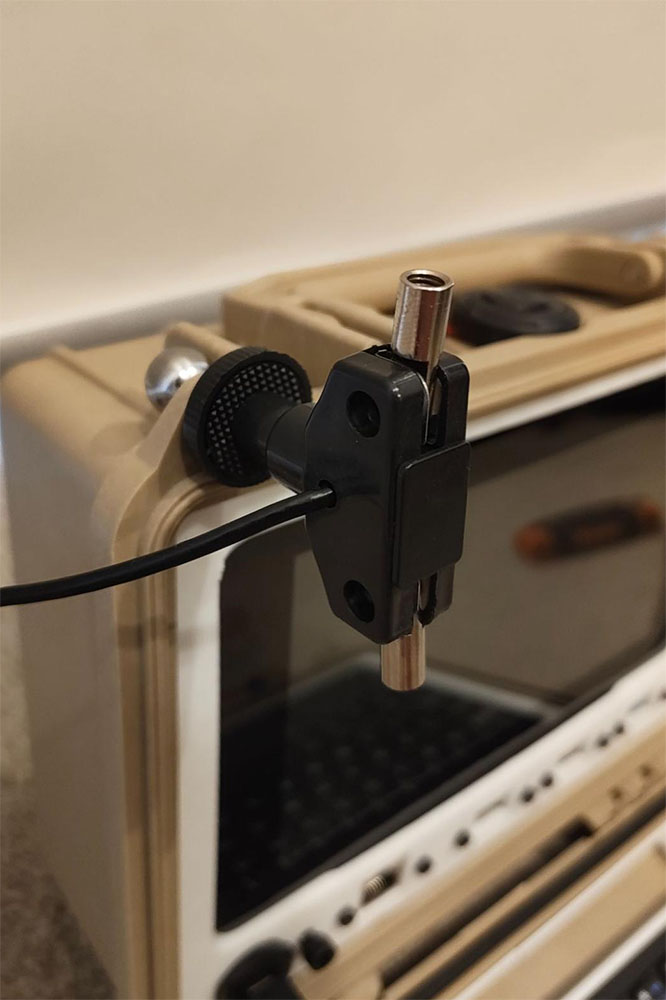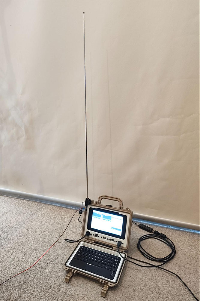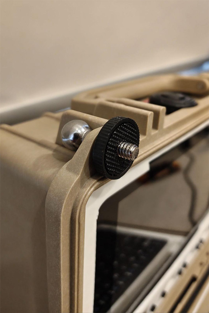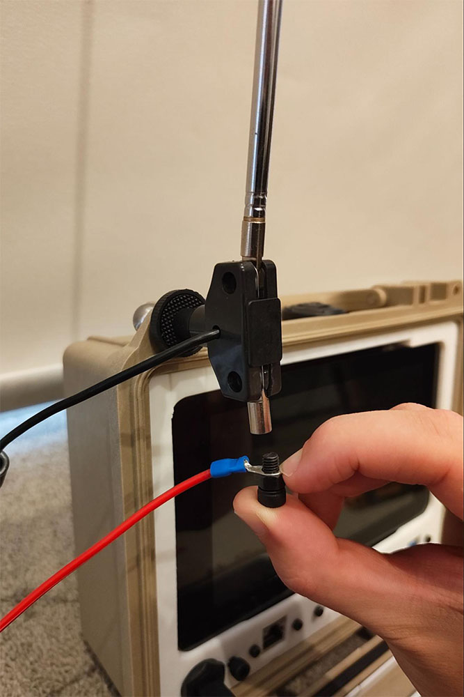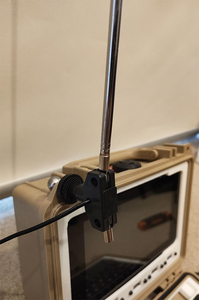 - If you have an RTL-SDR dongle with the antenna kit, you can proceed to use the ball mount from the provided tripod and feed it into one of the corner padlock holes of the Pelican case such that the screw end faces the user (screen side) - from there, you can screw on the textured plastic disc and then the dipole antenna. If you want something that performs arguably better than the stock dipole for minimal effort, I made an adjustable vertical whip with a random length of wire as a ground radial, as shown. The antenna can be tuned to the frequency of choice by lengthening or shortening the vertical telescopic whip. The addition of ground plane radials dramatically improves performance - you can add as many as you like by simply crimping on ring terminals to random lengths of wire and slipping these onto an M5 bolt.