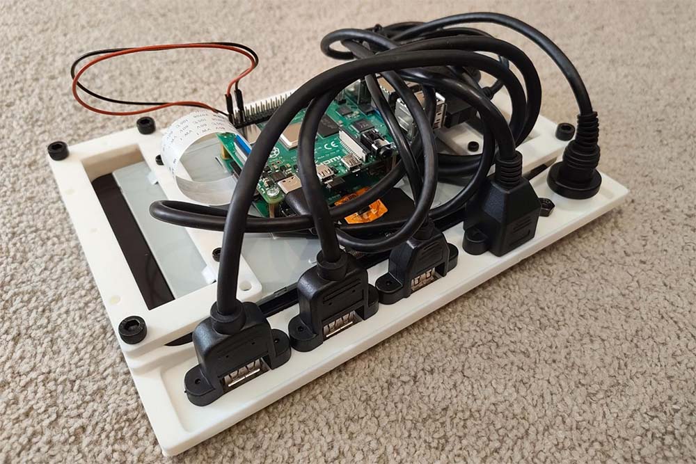 - Plug in all peripherals from the I/O panel to the Pi in such a way as to carefully route/manage the cabling to keep the entire panel assembly as compact as possible - this will help you a lot when fitting the device into the Pelican case.
