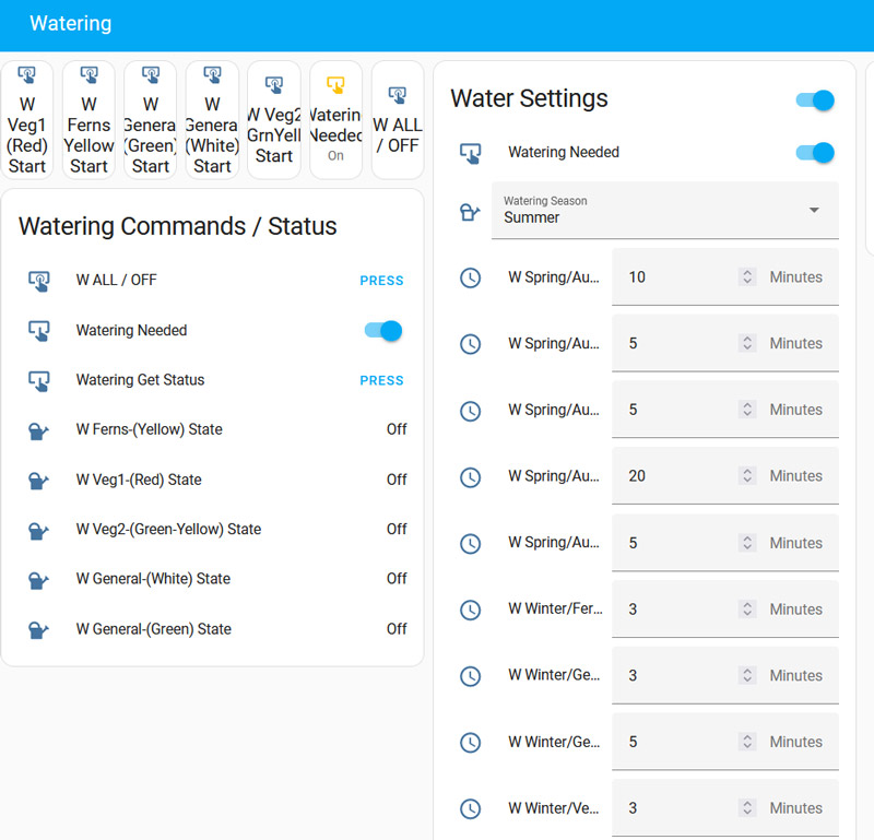 The attached code also includes functionality to remind the user (me) that the watering is turned off. I added this here because it was easier to port it from the Arduino C to Python than to bother with configuring it in Home Assistant (so I can be lazy too). And it had been added to the Arduino version because, more than once, I ‘turned off’ the master water switch whilst we were in a wet spell and then forgot about it only to have the plants start to die - maybe a moisture sensor would be a better answer! That could be my next mini-project.