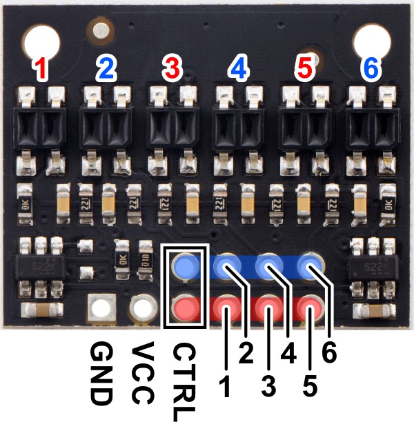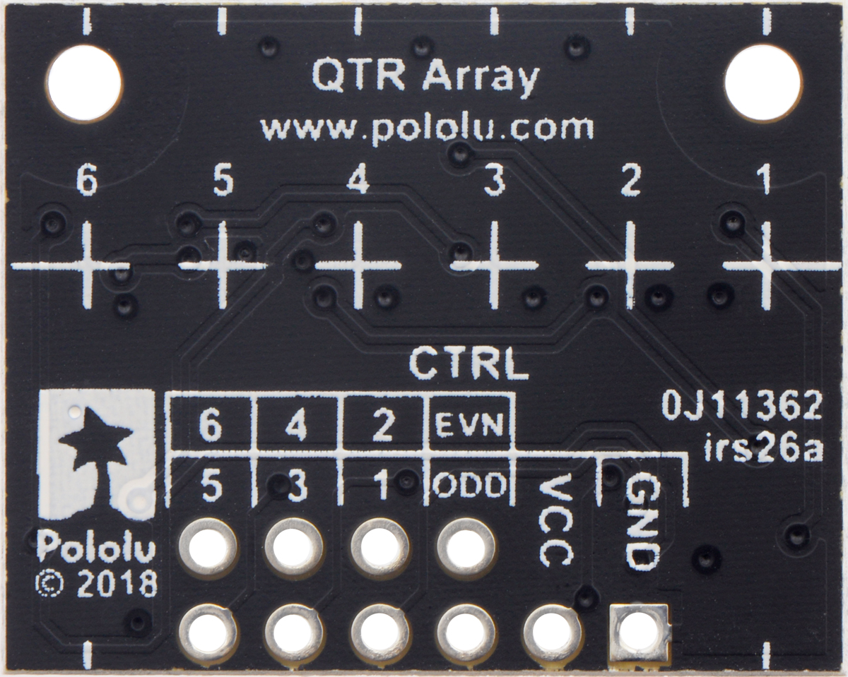 These reflectance sensor arrays maintain a constant current through their IR emitters, keeping the emitters’ brightness constant, independent of the supply voltage (2.9 V to 5.5 V). The emitters can be controlled with the board’s CTRL pins, and the details of the control depends on the array size and density: