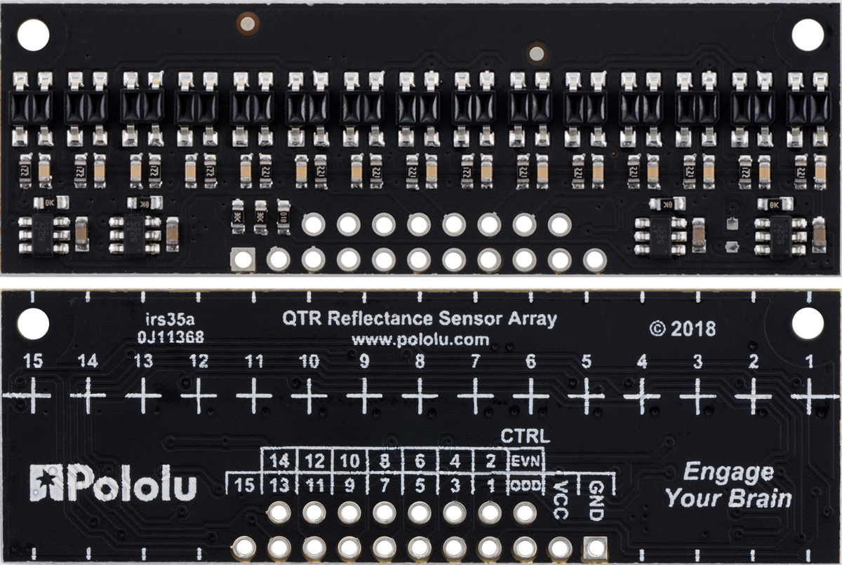 Unlike Pololu's original QTR sensor modules, these units have integrated LED drivers that provide brightness control independent of the supply voltage, which can be anywhere from 2.9 V to 5.5 V, while enabling optional dimming to any of 32 possible brightness settings. For high-density (HD) modules with five or more sensors and medium-density (MD) modules with eleven or more sensors, there are separate controls for the odd-numbered and even-numbered LEDs, which gives you extra options for detecting light reflected at various angles. See the “Emitter control” section below for more information on using this feature.