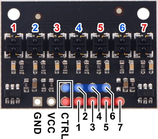 These reflectance sensor arrays maintain a constant current through their IR emitters, keeping the emitters’ brightness constant, independent of the supply voltage (2.9 V to 5.5 V). The emitters can be controlled with the board’s CTRL pins, and the details of the control depends on the array size and density: