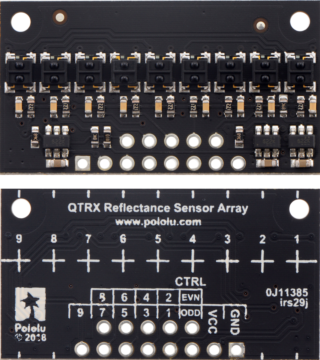 QTRX-HD-09RC Reflectance Sensor Array, front and back views.