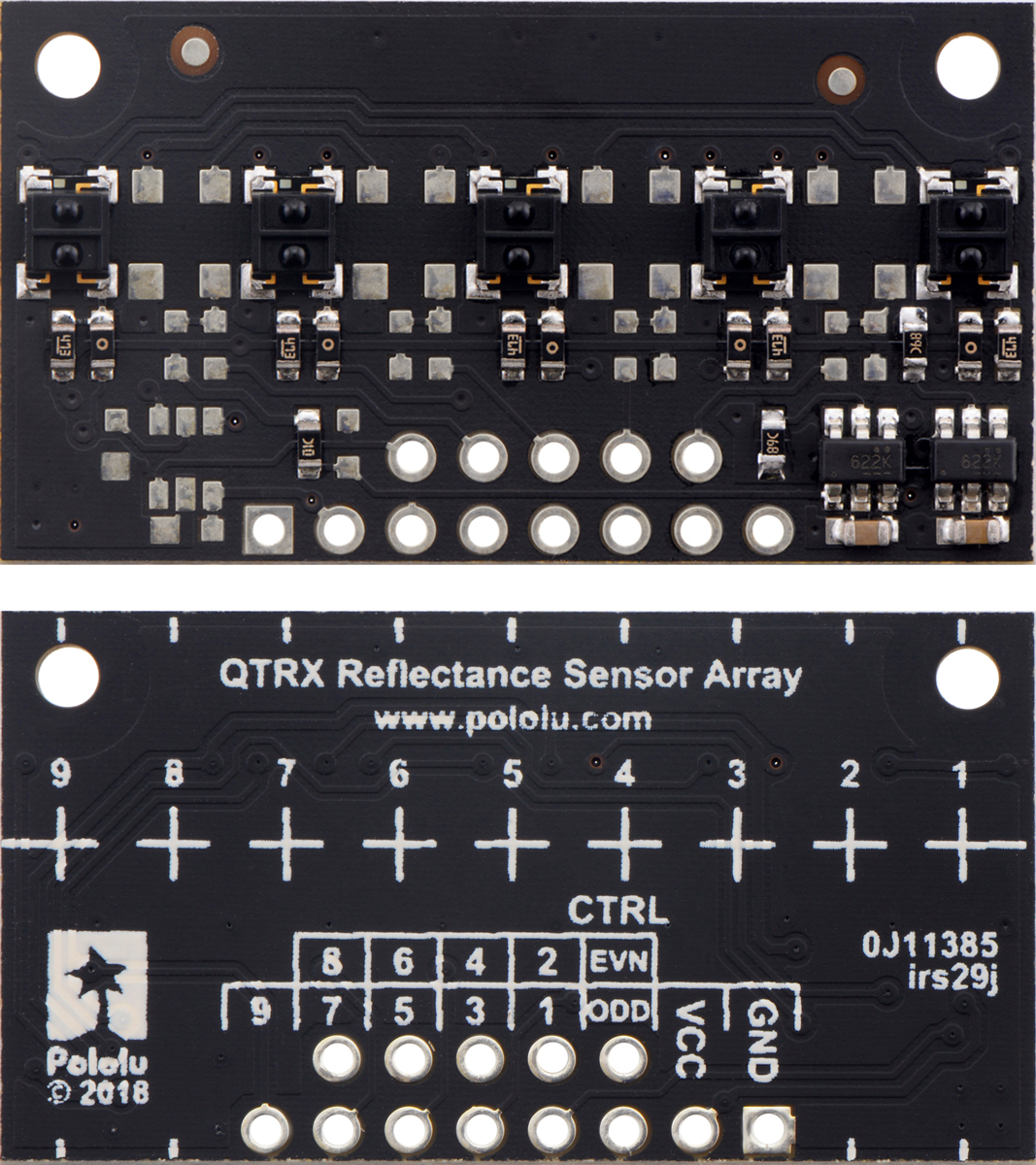 Two different sensor options are available, denoted by “QTR” or “QTRX” in the product name. The “QTR” versions feature lower-cost sensor modules without lenses while the “QTRX” versions feature higher-performance sensor modules with lenses, which allow similar performance at a much lower IR LED current. You can see the two different sensor styles in the pictures below of the 4-channel modules: