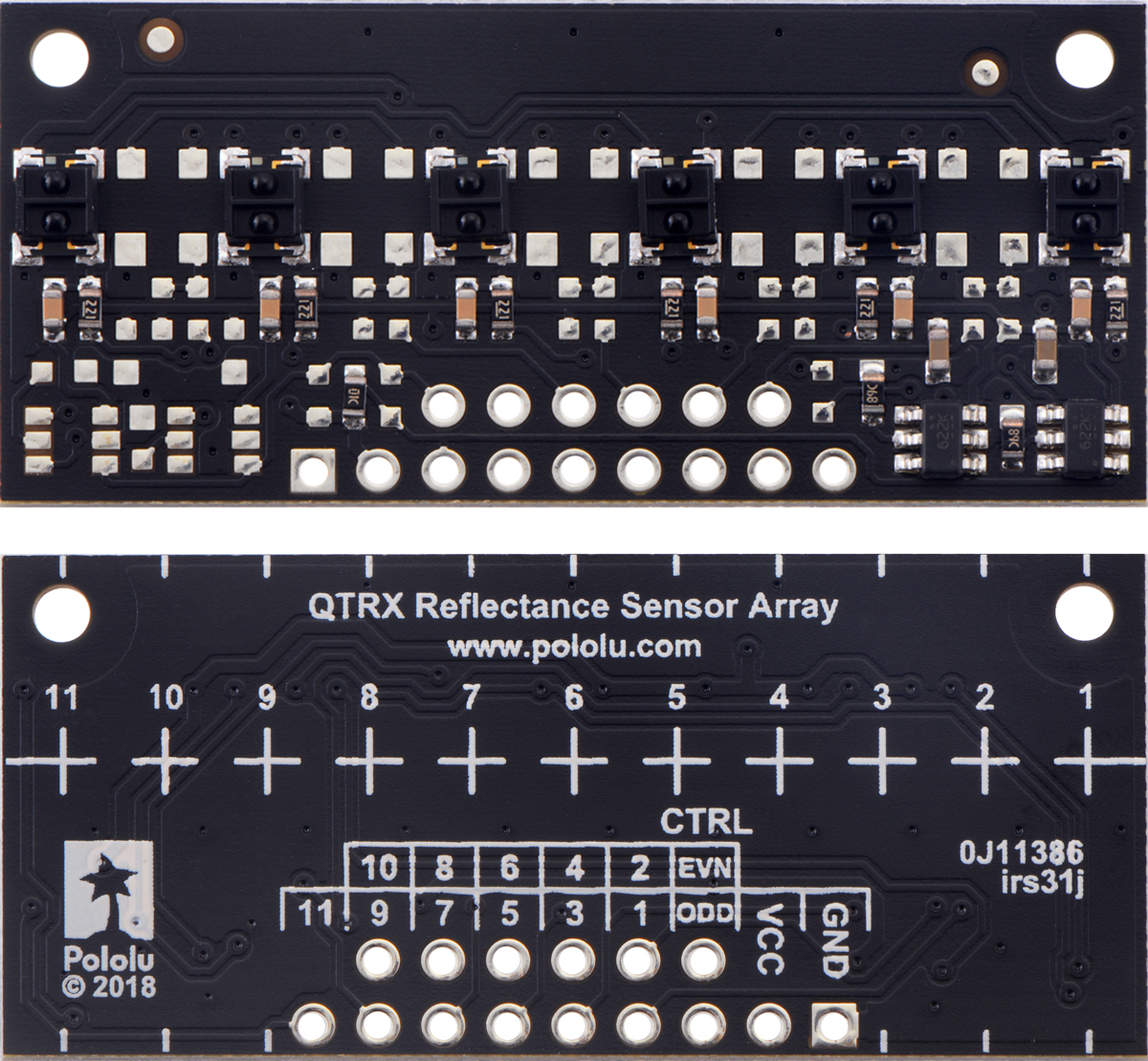 QTRX-MD-06RC Reflectance Sensor Array, front and back views.