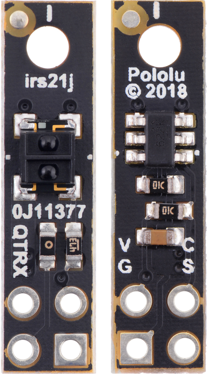 Two different sensor options are available, denoted by “QTR” or “QTRX” in the product name. The “QTR” versions feature lower-cost sensor modules without lenses while the “QTRX” versions feature higher-performance sensor modules with lenses, which allow similar performance at a much lower IR LED current. You can see the two different sensor styles in the pictures below of the 4-channel modules: