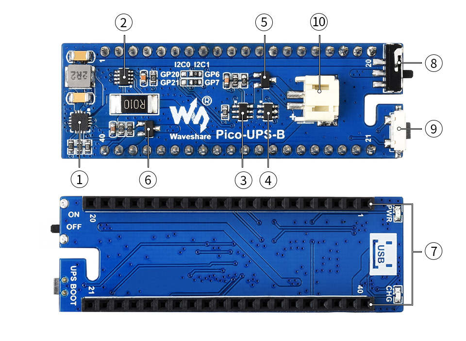 The Pico-UPS-B is a dedicated UPS (Uninterruptible Power Supply) module designed for Raspberry Pi Pico. It incorporates a Li-po battery switching charger with power path management, and also features onboard voltage/current monitoring via an I2C connection.